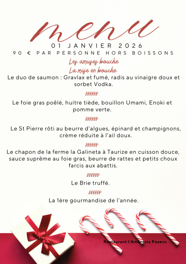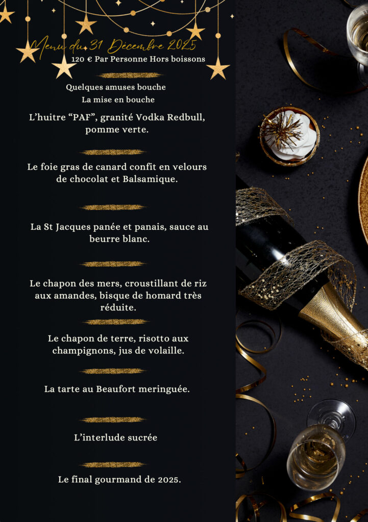 Menu du 31 Décembre 2025 120 € Par Personne Hors boissons Quelques amuses bouche La mise en bouche L’huître “PAF”, granité Vodka Redbull, pomme verte. Le foie gras de canard